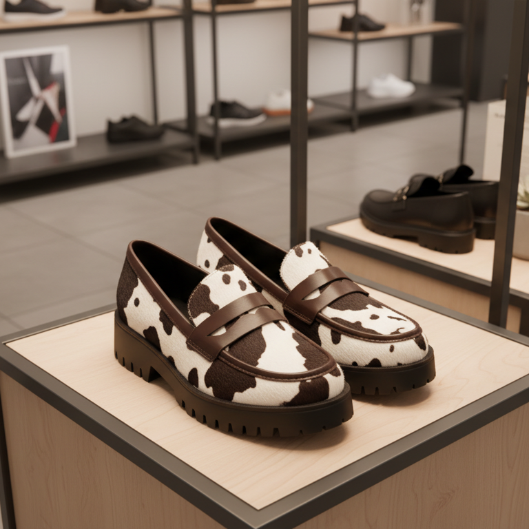 Affirmez votre style avec ces mocassins à plateforme audacieux, arborant un motif vachette noir et blanc distinctif. Conçues pour allier confort et tendance, ces chaussures présentent une empeigne en fausse fourrure douce avec des motifs irréguliers qui rappellent la robe d’une vache, apportant une touche d’originalité à toute tenue.