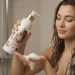 Visuel Évocateur : L’étiquette met en scène une femme aux cheveux luxuriants, symbolisant la beauté et la vitalité que procure le shampoing. Des roses fraîches et des pétales dispersés autour du flacon soulignent l’ingrédient phare et l’aspect naturel du produit. Un bol de riz et une petite fiole d’huile rappellent les composants bénéfiques et l’inspiration bio.