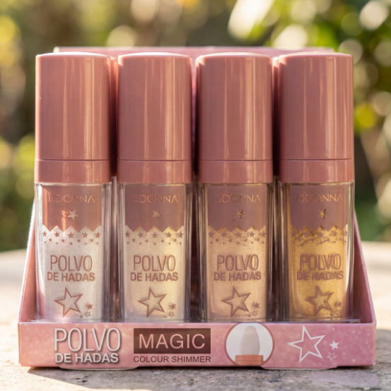 Le présentoir lui-même est conçu pour attirer l’œil, avec une base rose doux et les mots « POLVO DE HADAS » et « MAGIC COLOUR SHIMMER » écrits en lettres dorées et roses scintillantes. Une étoile lumineuse sur le côté ajoute une touche finale de fantaisie.