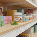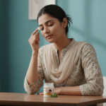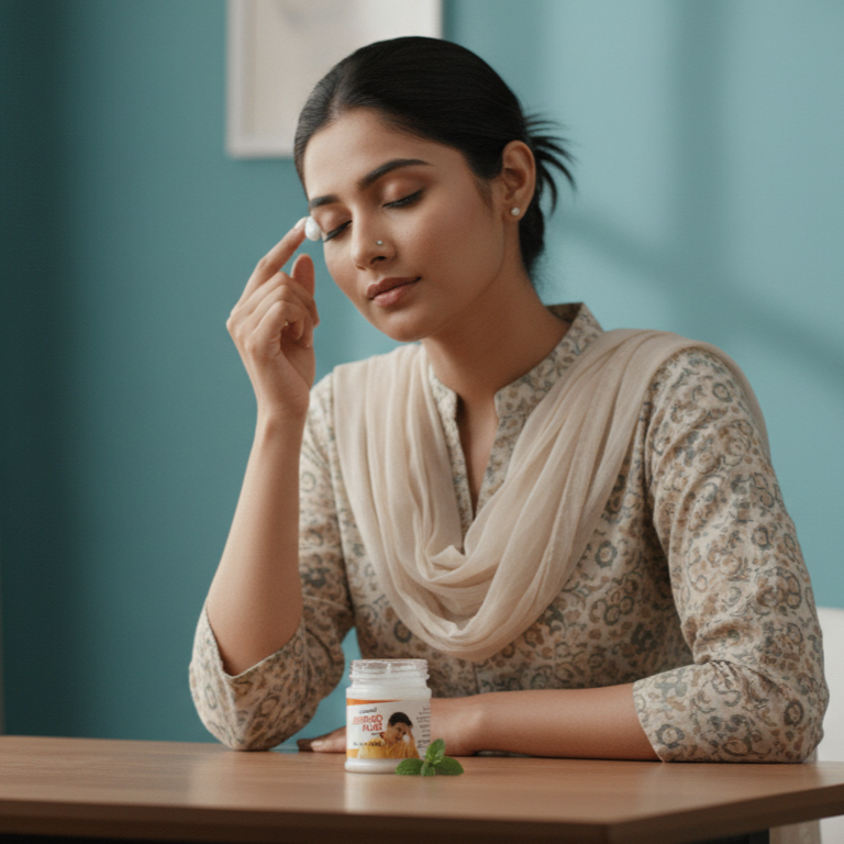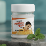 Le pot est coiffé d’un couvercle blanc simple et sécurisé, assurant la préservation du baume. Il repose sur une surface texturée de couleur grise, et l’arrière-plan doux et flou est d’un bleu sarcelle apaisant, créant une ambiance qui évoque le calme et le soulagement. La présentation globale est celle d’un produit médical accessible, destiné à offrir un confort rapide.